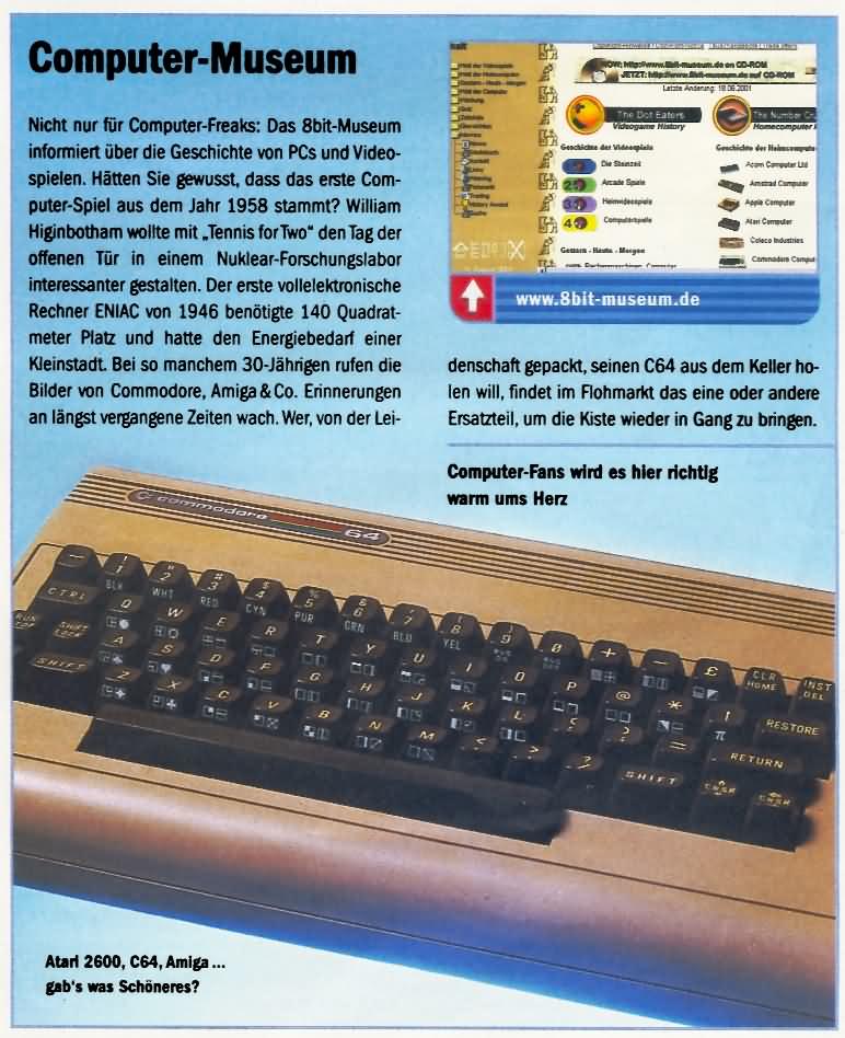 com!online berichtet in der Ausgabe 10/2001 auf Seite 91 über das8bit-Computer-Museum. Der Artikel (104 KB als JEPG) zeigt als Abbildung zur Homepage-Rezension einen C64 in Großaufnahme.